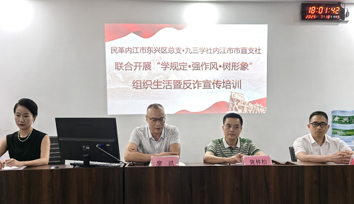 7月18日下午,九三学社内江市市直支社与民革内江市东兴区总支联合开展“学规定·强作风·树形象”主题教育暨反诈宣传培训活动。九三学社内江市委员会副主委林海亮,秘书长吴英,中共东兴区委常委、统战部部长黄林松等领导出席,50余名同志参加活动。